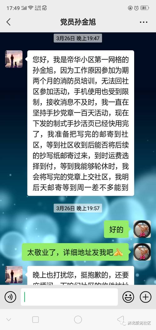 在本期的活动中,有这样一位党员,他的名字叫孙金旭,是一名消防队员,目前因工作需要正在参加为期两个月工作培训。这次培训任务重、强度大,孙金旭同志克服种种困难,牺牲自己休息时间,在午休、在傍晚利用闲碎的时间抄写党章。在外培训无法送党章的手抄稿到社区,他积极与社区沟通,请求邮寄手抄稿,并主动沟通党费交纳事宜。这些点点滴滴充分体现着孙金旭勤奋好学、艰苦朴素的优良品质