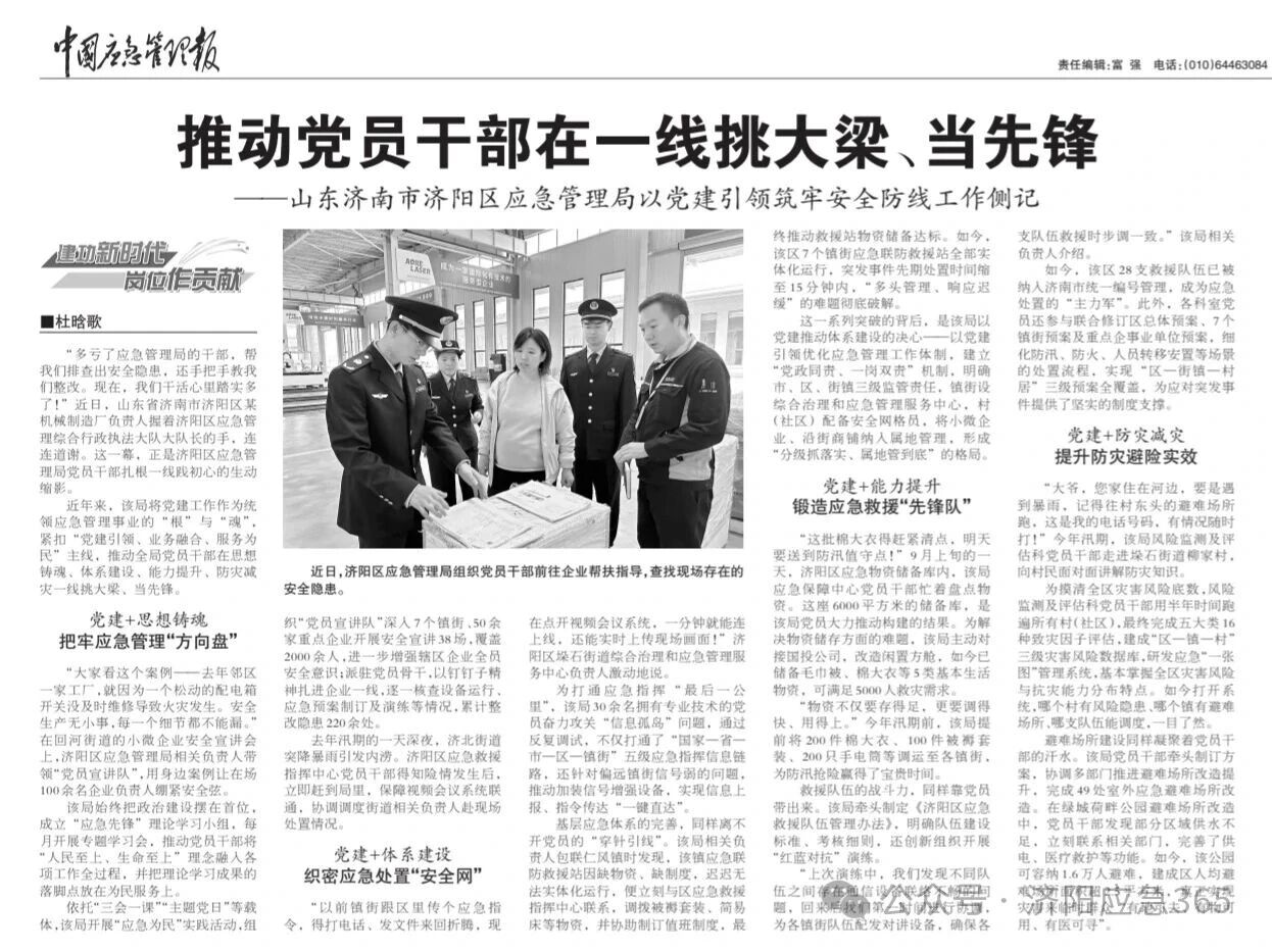 此文章在中国应急管理报2025年12月2日第三版党建版刊发报道,全面展现了济阳区应急管理局“党建红引领应急蓝”的工作成效。作为辖区安全的守护者之一,该局始终将党建工作与应急管理深度融合,构建“支部建在应急队、党员冲在第一线”的组织体系,通过设立党员先锋岗、责任区,推动党员干部在隐患排查、应急处置中带头攻坚。以党建聚合力、以创新破难题,用实际行动践行“人民至上、生命至上”理念。