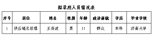 根据《山东济北投资控股集团有限公司2026年3月公开招聘公告》要求,通过履历评价、面试、背调、体检等程序,确定王存波同志为山东济北投资控股集团有限公司拟考察录用人员(名单附后),现予以公示,公示期5个工作日。
