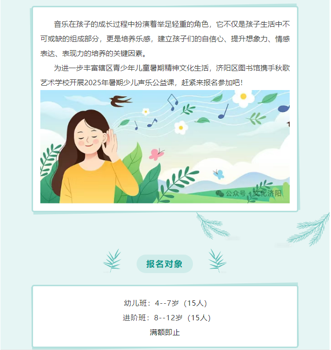 【相约图书馆 公益文化行】 济阳区图书馆少儿声乐暑期公益培训班报名啦