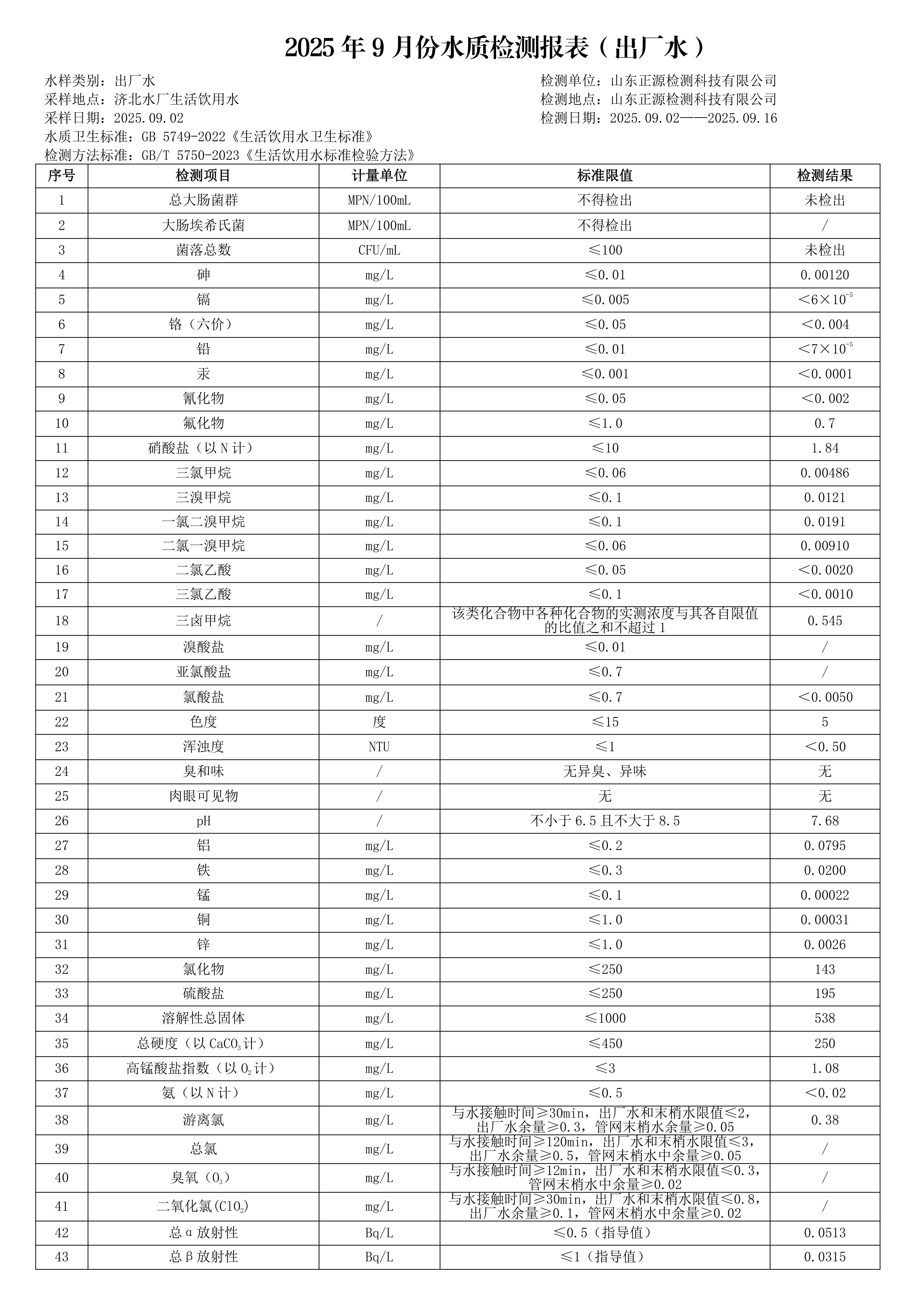 【 水质信息】济南市济阳区农发供水有限公司2025年09月水质信息公开