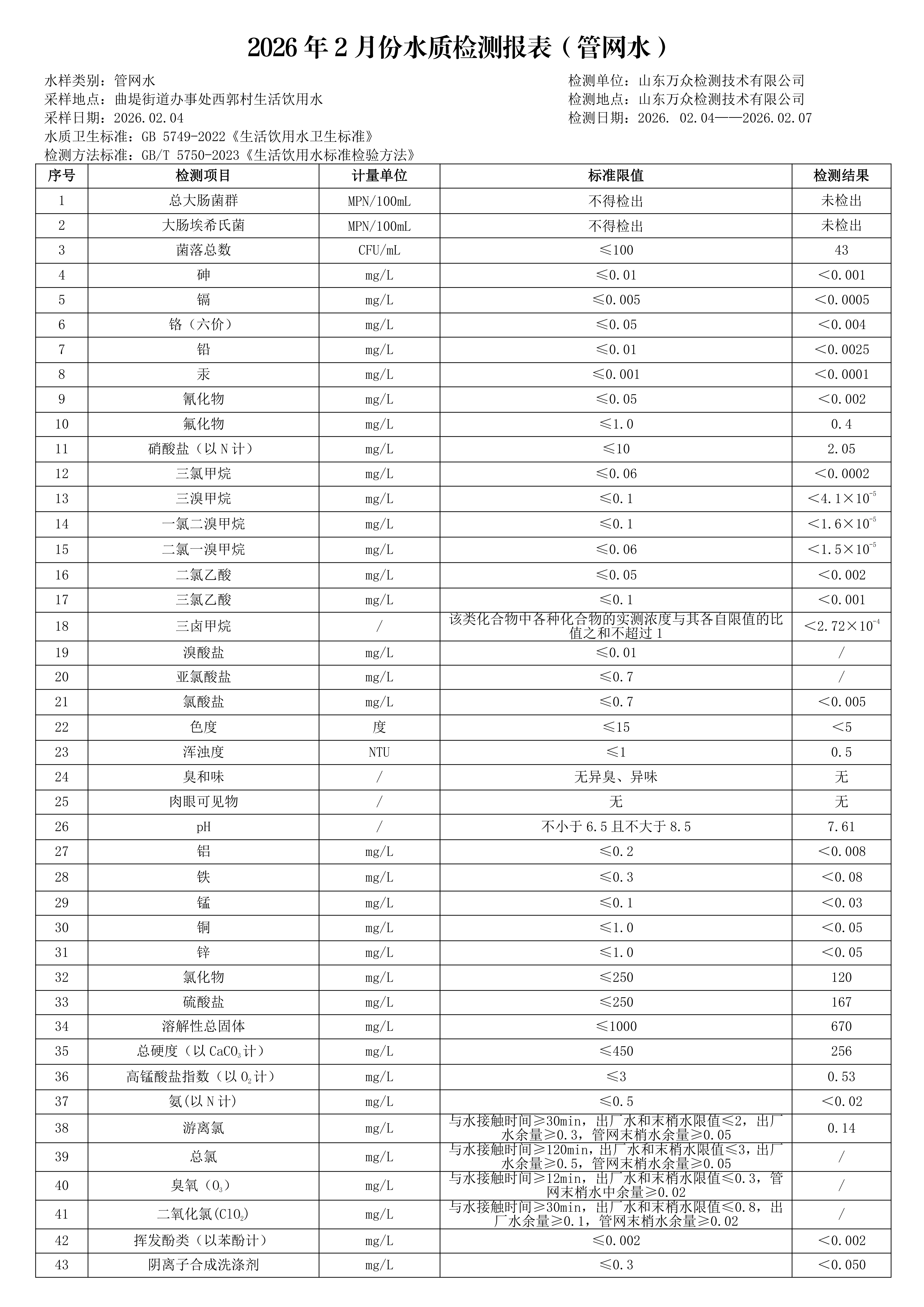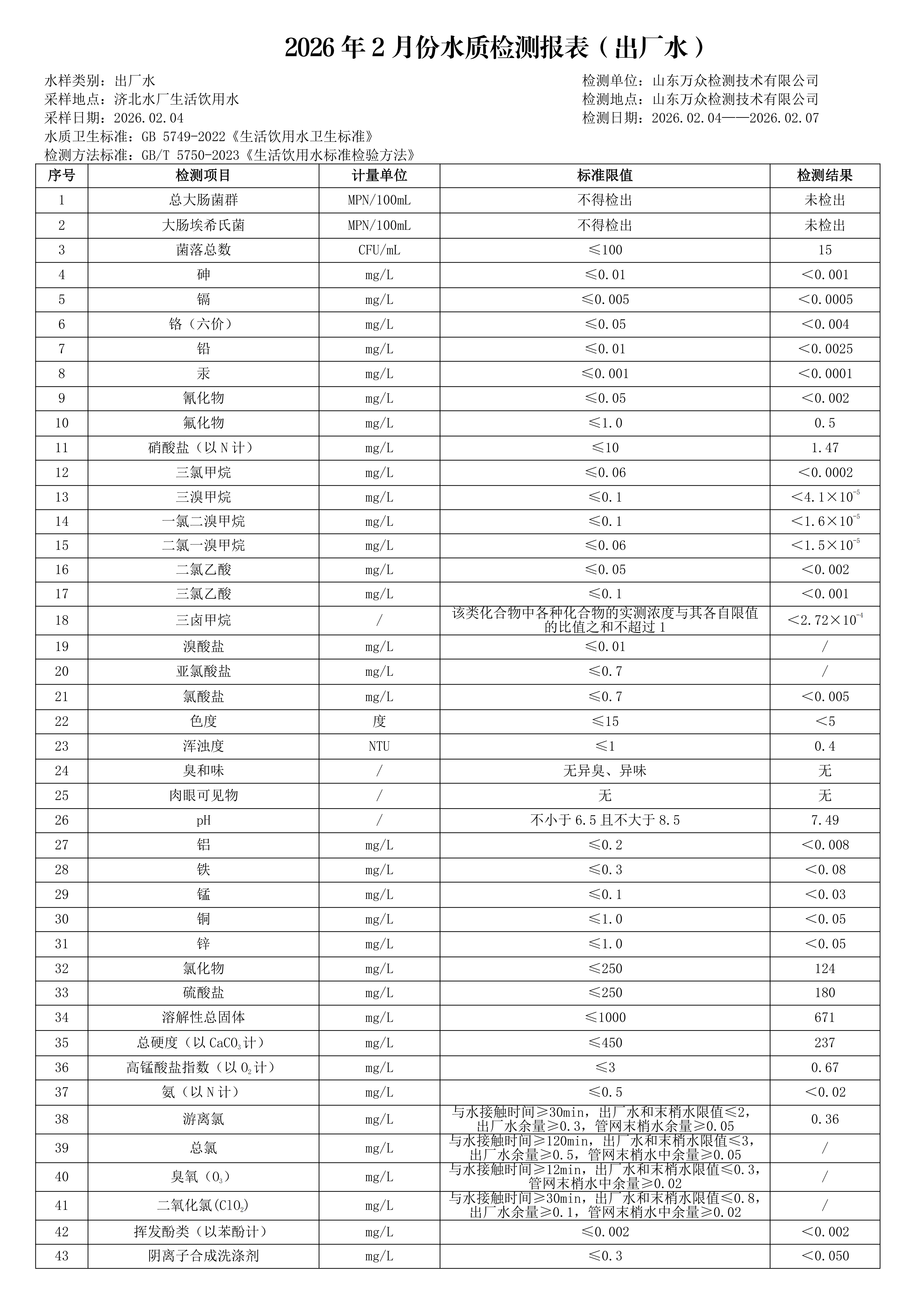 【 水质信息】济南市济阳区农发供水有限公司2026年02月水质信息公开
