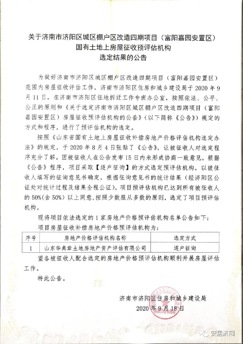 济南市济阳区城市更新服务中心张贴国有土地上房屋征收预评估机构选定结果的公告